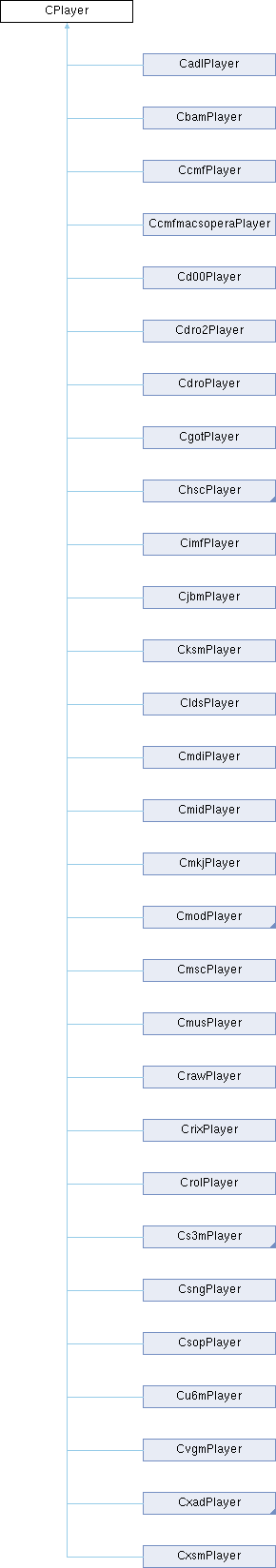 Implemented in CadlPlayer, CbamPlayer, CcmfmacsoperaPlayer, CcmfPlayer, Cd00Player, Cdro2Player, CdroPlayer, CgotPlayer, ChscPlayer, CimfPlayer, CjbmPlayer, CksmPlayer, CldsPlayer, CmdiPlayer, CmidPlayer, CmkjPlayer, CmodPlayer, CmscPlayer, CmusPlayer, CrawPlayer, CrixPlayer, CrolPlayer, Cs3mPlayer, CsngPlayer, CsopPlayer, Cu6mPlayer, CvgmPlayer, CxadPlayer, and CxsmPlayer.