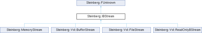 Implemented in Steinberg::MemoryStream, Steinberg::Vst::BufferStream, Steinberg::Vst::FileStream, and Steinberg::Vst::ReadOnlyBStream.
