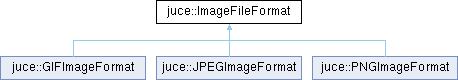 Implemented in juce::GIFImageFormat, juce::JPEGImageFormat, and juce::PNGImageFormat.