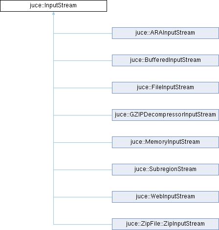 Implemented in juce::ARAInputStream, juce::BufferedInputStream, juce::FileInputStream, juce::GZIPDecompressorInputStream, juce::MemoryInputStream, juce::SubregionStream, juce::WebInputStream, and juce::ZipFile::ZipInputStream.
